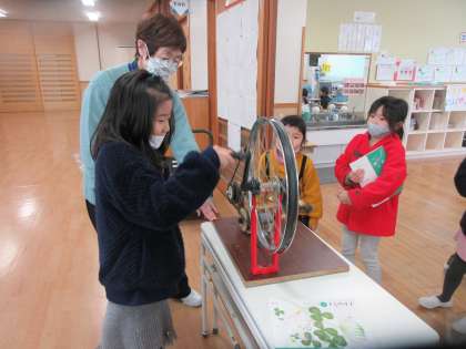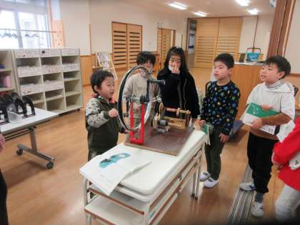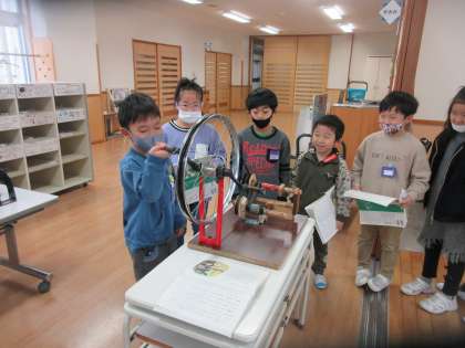 国語科「たぬきの糸車」の世界を味わうために、糸車に似せて作った模型を、キーカラカラの擬声音を楽しみながら糸車を回す疑似体験をしました。子供たちは大好きないたずらもんのたぬきになりきっていました。