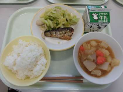 今日の給食は、ごはん・牛乳・豚肉とじゃがいものうま煮・野菜ソテー・いわしのおろしにです。豚肉とじゃがいものうま煮は、豚肉のうまみがしみていておいしかったです。