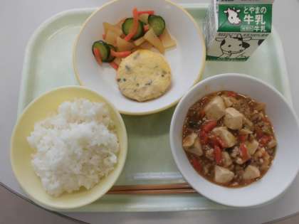 今日の献立は、ご飯・牛乳・かにたま、華風和え・マーボー豆腐です。