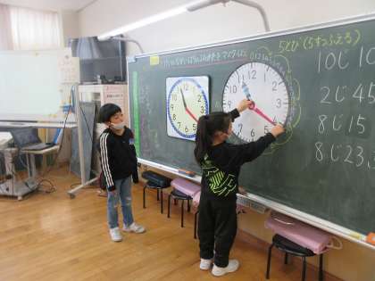 時計の勉強は、2学期は○時、○時半を習いましたが、いよいよ今回は長い針を読み、○時○分と言うことができるようになる学習に入りました。長針の読み方が分かったところで、実際に時計を操作し理解を深めました。