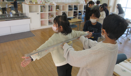 1メートル物差しを使って、1メートルの長さがどれくらいか考えました。「メートル」「センチメートル」「ミリメートル」と、いろいろな単位を学習しました。それぞれの長さの感覚を覚えていきましょう。