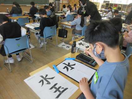 毛筆書写で「水玉」を書く練習をしました。これまでに学習した「はね」や「はらい」等の総まとめです。