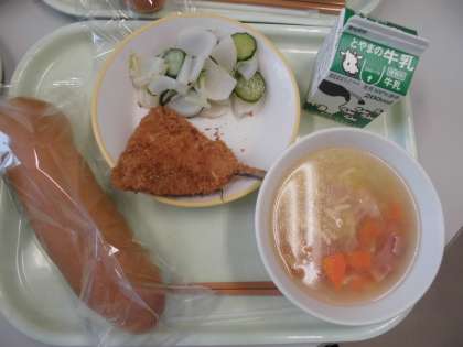 今日の給食は、黒糖コッペパン・牛乳・マカロニスープ・かぶのサラダ・あじフライです。マカロニスープには、ローマ字や数字のマカロニがはいっていて楽しみながら食べることができました。