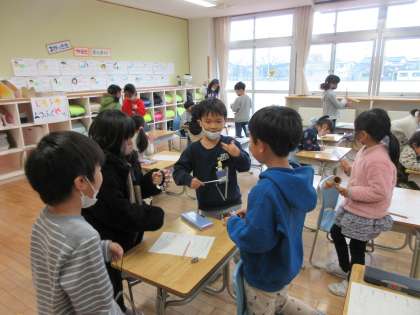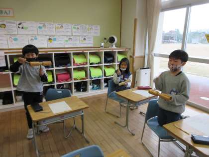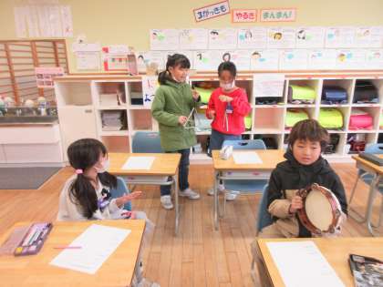 今日の音楽では、タンバリンやすずなど、いろいろな打楽器を自分が考えた奏法で音を鳴らしてみました。どんな音色になるのか楽しみながら活動しました。最後には「きらきらぼし」のメロディに合わせて合奏を楽しみました。