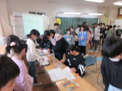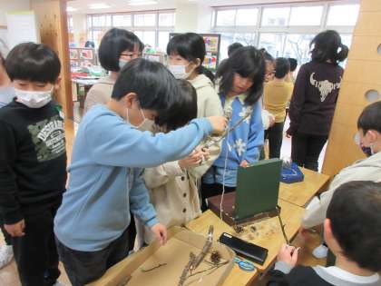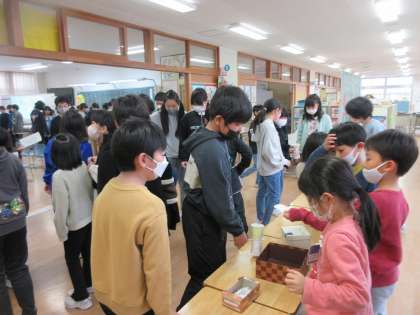 今日は、2年生を招待しての「おもちゃまつり」・・・のはずが、兄姉にも来てほしいなという声が上がり、5分休憩の間に誘いに行った子供たち。自主的に、他の学年にも声を掛けたいと思い立ち、全学年にお知らせに言ったとのこと!なんと、のびのびタイムに全校の子供たちが、1年生の「おもちゃまつり」に集結してくれました。