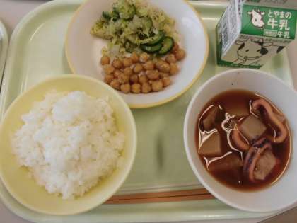 今日の給食は、ごはん・牛乳・いかとさといもの煮物・ゆかり和え・フライビーンズです。いかとさといもの煮物は味がしみこんでいておいしかったです。フライビーンズは子供たちも食べやすいように甘めな味付けで調理されています。