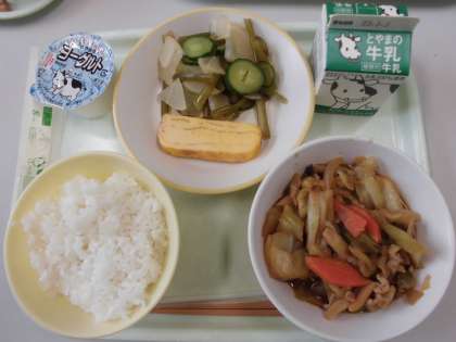 今日の献立は、ご飯・牛乳・厚焼き卵・茎わかめの酢の物・回鍋肉・ヨーグルトです。
