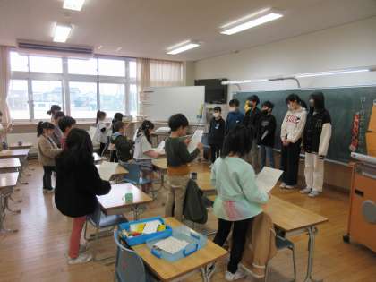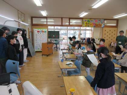 「卒業を祝う会」の歌の練習が始まりました。1年生の「祝う歌係」が5年生にお願いし、5年生が歌の指導に来てくれました。みんな、5年生のアドバイスを聞きながら必死に歌っていました。