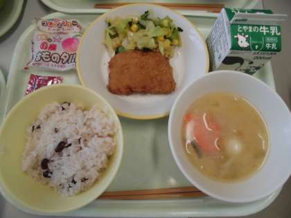 今日の給食は、赤飯・牛乳・コーン和え・とんかつ・紅白白玉汁・もものタルトです。今日は卒業お祝い献立です。6年生のみなさん6年間、給食をたくさん食べてくれてありがとうございました^^中学校へいってもたくさん食べて元気に過ごしてください。