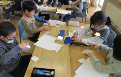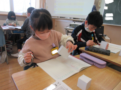 2年生の算数科の学習も終わりに近づいています。今日は箱を実際に作ってみました。箱を作った後、平らな部分はどんな形をしているのか、面をノートに写し取りました。