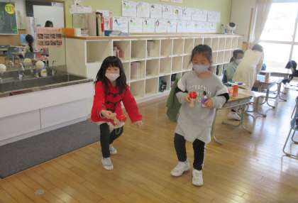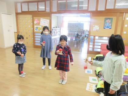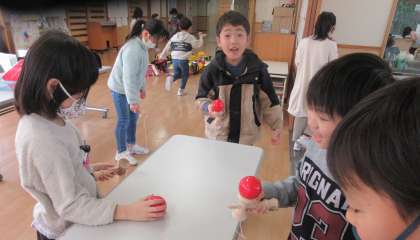 昔の遊びに取り組む活動として、けん玉に挑戦しました。みんな初めは四苦八苦していましたが、慣れてくると徐々に入り出し、大歓声をあげていました。また、机の上に玉を置いて、転がしてキャッチする遊びも考え、夢中になって遊びました。