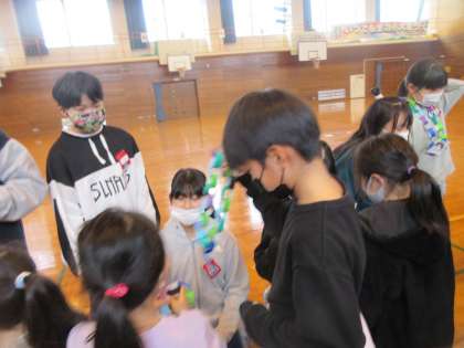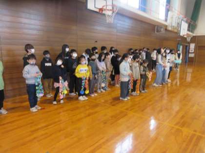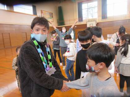 卒業を祝う活動のひとつとして、1年生が6年生の似顔絵を描き、それを5年生がメダルに仕上げてくれました。今日は、それを直接渡す日です。少し照れながら、各自おめでとうやありがとうの言葉を添えて、6年生の首にメダルをかけてあげました。6年生もとても嬉しそうで、1年生も大満足でした。また、企画してくれた5年生にも感謝の気持ちを伝えました。