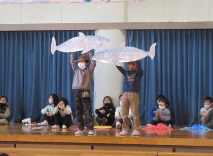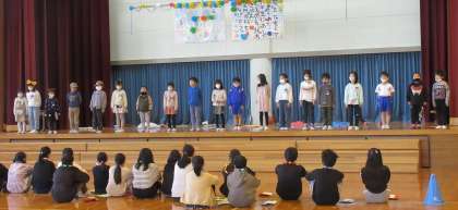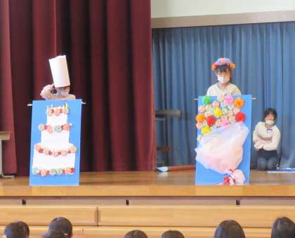 いよいよ卒業を祝う会です。1年生は、以前6年生にインタビューして聞き取った「将来の夢」について、紹介する「将来の夢ファッションショー」を出し物として披露しました。自分の役柄のセリフと動き、小道具を考え、堂々と発表しました。