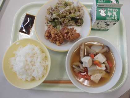 今日の献立は、ご飯・牛乳・鶏肉の竜田揚げ・ゆかり和え・けんちん汁・のり佃煮です。