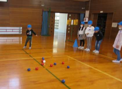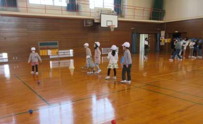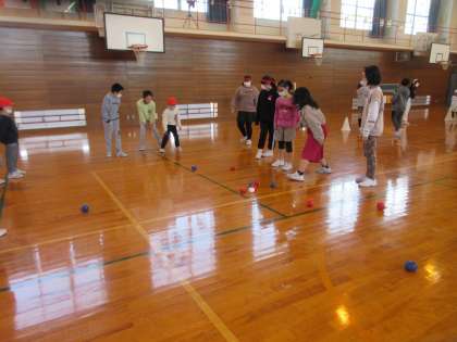 6年生から、卒業の活動のひとつとして、下級生とボッチャをする活動に誘っていただきました。赤、白、青の色団に分かれて、6年生と対戦しました。みんな夢中になって、的玉に近づけるように投げていました。結果は・・・なんと、赤、白団は1年生が勝利しました。もしかしたら、ちょっと手加減をしてくださったのかもしれませんが、1年生は大喜びでした。ありがとう、6年生!