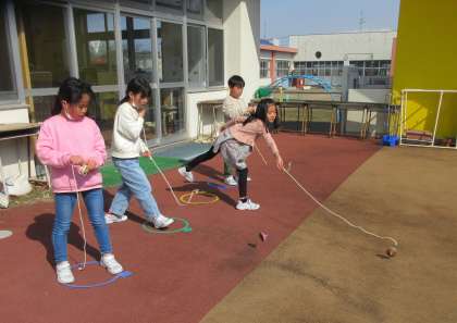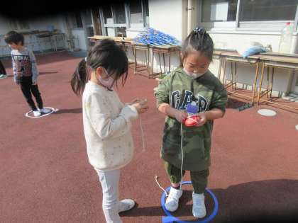 けん玉に引き続き、昔の遊び体験としてコマ回しに挑戦しました。けん玉以上jにひもを巻くことや投げ方が難しいのですが、粘り強くがんばっていました。