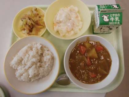 今日の献立は、カレーライス(麦ご飯)・牛乳・福神和え・フルーツヨーグルトです。