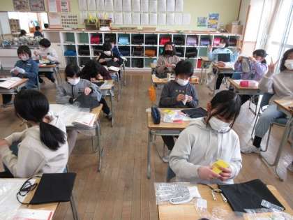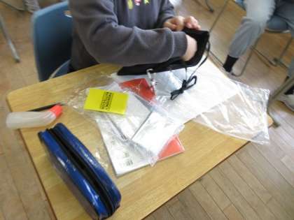 もうすぐ「3.11」です。4年生の国語では、「もしものときにそなえよう」で防災について調べたことを作文にして発表しました。そして、実際の防災グッズを手に取り、なぜ必要かを知ったり、使い方を学んだりして、防災意識を高めました。