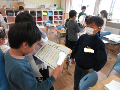 今日は友達のすてきなところを手紙に書き、それぞれの友達に渡しました。もらった子供たちは、友達から手紙を受け取ると、とてもうれしそうでした。