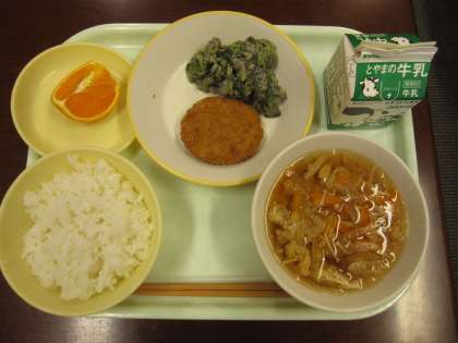 献立は、ごはん、牛乳、豆とかぼちゃのコロッケ、よごし、沢煮椀、清見オレンジです。