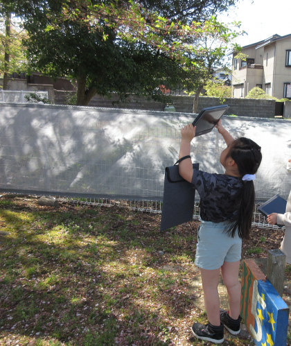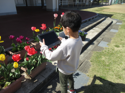 今日は、図画工作科「おはなみスケッチ」の学習で、外に出て題材を探しに行きました。春らしいものを探しに行くと、「チューリップがきれい!」「アリがいたよ」などと話しており、いろいろな発見があったようです。