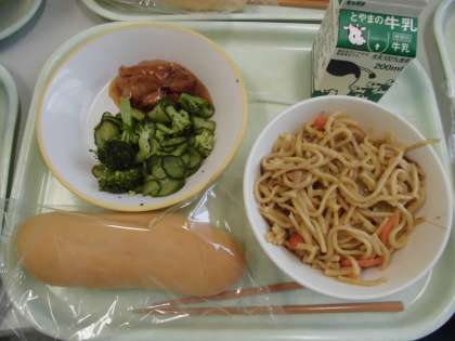 今日の給食は、減量コッペパン・牛乳・やきそば・照り焼きチキン・えごまドレッシングサラダです。えごまのサラダは、えごま、砂糖、酢、油で作った手作りドレッシングに野菜を和えたものです。さっぱりしていて食べやすいです。やきそばも子供たちに人気でした!