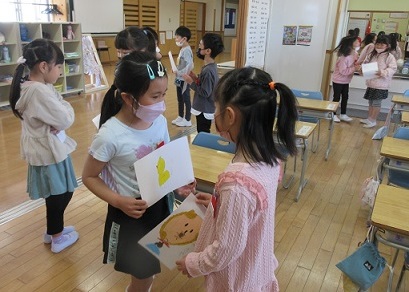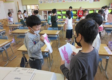 国語科「あつまって はなそう」の学習で、子供たちは自分の好きな動物を画用紙に描き、それを持って自己紹介をし合いました。「どうして、猫が好きかというと、…」としっかりと理由も話すことができました。最後に握手をして、教室中に笑顔が広がりました。