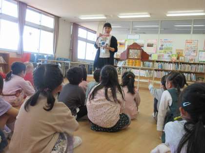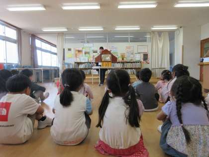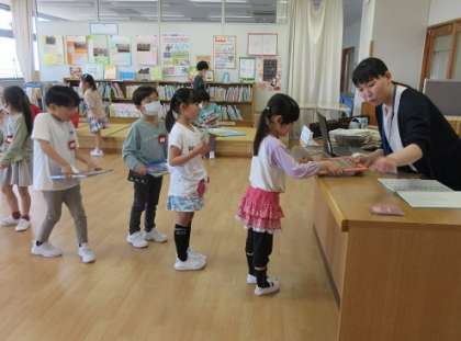 以前に学校探検で図書室を見付けてから、早く本を借りてみたいと願っていた子供たち。この日は、図書室で司書の先生から、紙芝居を使って「図書室の使い方・ほんの借り方」のお話を聞きました。最後に、自分の読みたい本を見付けて、借りることができ、学校生活がまた一つ、広がりました。