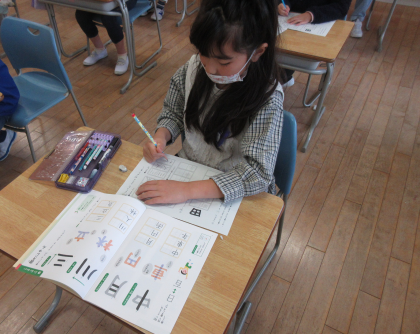 書写では書き順を学習しました。「上から下」「左から右」「外がわから内がわ」「つきぬけるせんはさいご」など、書き順のきまりを確認しました。「ぐう・ぴん・ぺた」の姿勢にも気を付けて、がんばっていきましょう。