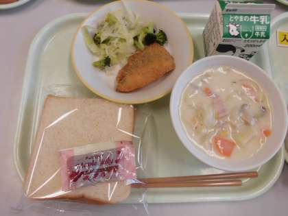 今日の給食は、食パン・牛乳・クリームチャウダー・ブロッコリーサラダ・サーモンフライ・メープルジャムです。今日はサミット給食のカナダです。サーモンはカナダを代表する魚です。サーモンフライはカラっと揚がっていておいしいかったです。メープルシロップはカナダのカエデの木の樹液を煮詰めて作ったカナダの特産物です。パンにつけておいしくいただきました。