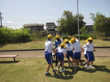 すがすがしいお天気の下、東公園へファミリー遠足に行きました。各団に分かれ応援練習をした後、ファミリー班ごとにポイントラリーをしました。8箇所のポイントを回り、しりとりやなべなべそこぬけなど指令を協力して行い、ひらがな一文字の暗号をゲットします。8個の暗号を集めたら、ある言葉に・・・それは何かお子さんに聞いてみてくださいね。ファミリーが仲良くなれた一日でした。