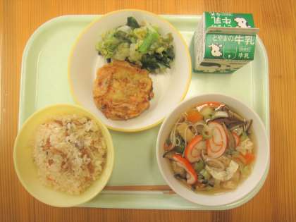 富富富の五目ご飯、牛乳、白エビのかき揚げ、とろろ昆布和え、大門そうめん汁です。富山の食材満載でした。