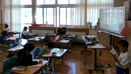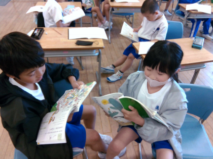 国語科では、大事なことを落とさないように、「聞く」「話す」の学習をしています。絵の中の遊園地を見て、探してほしいともだちの服装や髪型の特徴を伝え、探すといったペア活動をしました。「わかりやすく伝える」「しっかり聞く」という力を伸ばしていきましょう。