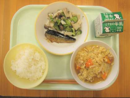 今日の給食は、ごはん、牛乳、いわしのピリ辛煮、ブロッコリーとキノコのソテー、卵とじです。