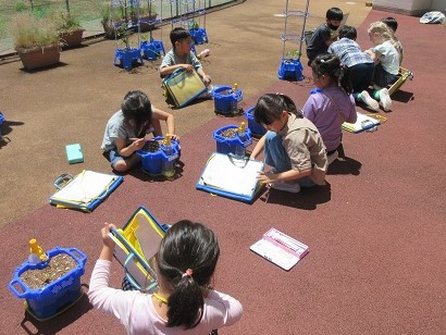5月19日にあさがおの種をまきました。「早く芽がでますように」と、あさがおの様子を見て、世話をするのが、毎朝の日課となりました。生活科の時間には、あさがおの芽が出た喜びを「あさがお日記」に丁寧にかきました。これからの成長が楽しみです。
