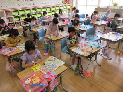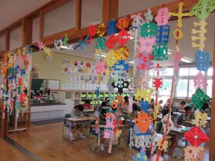 いろいろな色の折り紙を折って、「ちょきちょき」はさみで切ると、きれいな形ができました。それをつなぐと、カラフルで楽しい飾りのできあがりです。学級のみんなの作品を教室の入り口に吊すと、とてもきれいで賑やかになりました。そこをくぐるときのみんなの顔が、とてもうれしそうでした。