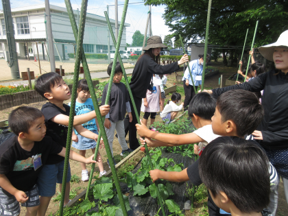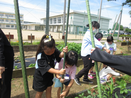 朝に「大成っ子ガーデンの様子を見に行った子供から、「きゅうりにつるが出来てる」「トマトの茎が斜めになっている」と話がありました。そこで今週の生活科の時間に、ガーデンの庭を手入れしました。野菜がしっかり生長できるよう、子供たちが協力して支柱を立てたり、脇芽を摘んだりしました。
