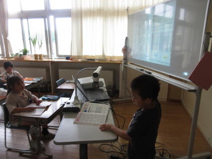 教科書に載っている大量のクリップを見て、いくつあるかを考えました。写真は、235個あるクリップをどのように数えたか自分の考え方を発表している様子です。これまで習った数より、大きい数を学習していきます。がんばりましょう。