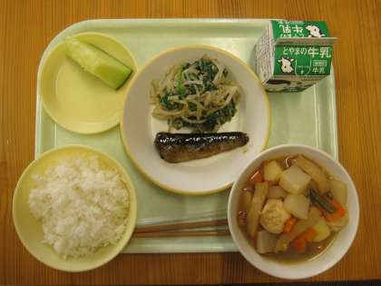 今日の給食は、ごはん、牛乳、いわしの生姜味、関東炊き、ほうれん草のごま和え、メロンです。