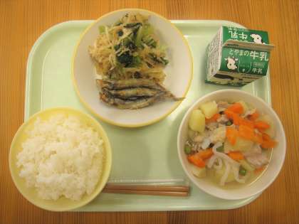 今日の給食は、ごはん、牛乳、ししゃものから揚げ、はいはり和え、塩肉じゃがです。かみかみ献立〜カルシウムをとろう〜でした。