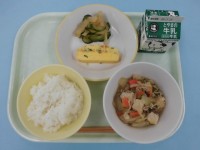 今日の給食は、カレーライス、牛乳、大根サラダ、味付け小魚です。