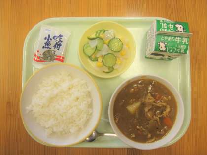 今日の給食は、カレーライス、牛乳、大根サラダ、味付け小魚です。