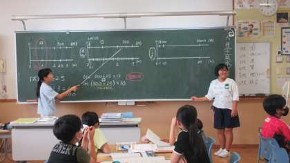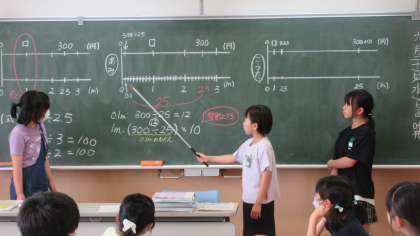 子供たちは自分たちのグループの考えを他のグループに理解してもらうためにはどうしたらよいか考えました。話す役と黒板に文字を書く役に分かれる工夫をして、相手に伝わるように説明をしました。