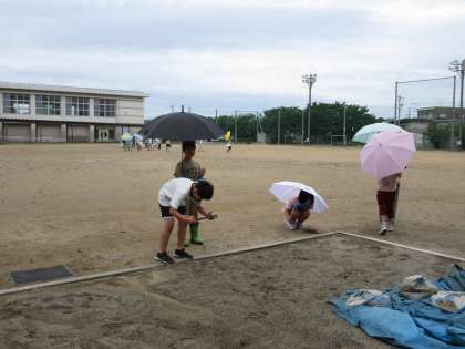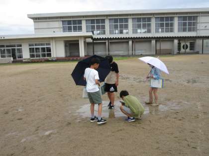 雨が降った後のグラウンドの様子を観察しました。「地面がななめになっている」「水たまりがあるところとないところでは何がちがうのかな」など、疑問をもちながら観察したり、記録したりしましした。