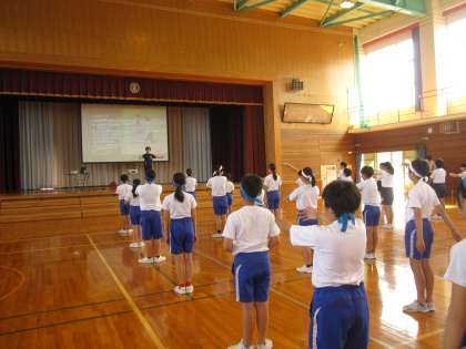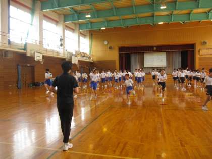 水橋中学校の先生が来てくださり、走り方などを水橋東部小、水橋西部小と一緒に教わりました。