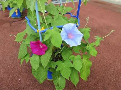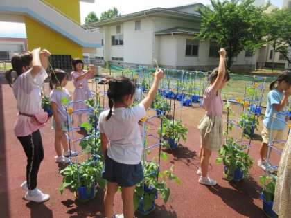 梅雨の雨と初夏の日差しを浴び、あさがおはぐんぐん伸びています。つるの長さを自分の背と比べたり、つぼみや花の数を数えたりしながら、朝は大歓声が響きます。