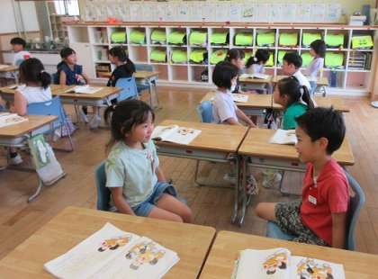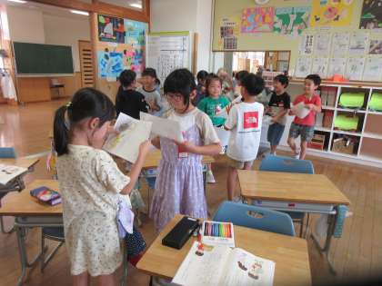 国語科では、自分の好きなものを伝える学習に取り組みました。隣りの友達とペアを組み、互いに好きなものとそのわけを伝えました。伝えた後には、ペアの友達から「わたしもやってみたいです」「とてもかわいいので、触ってみたいです」など、感想を言ってもらい、とても喜んでいました。
