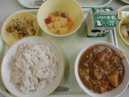 今日の給食は、麦ごはん・牛乳・夏野菜カレー・ふくじん和え・フルーツカクテルゼリーです。夏野菜カレーは、なすやかぼちゃやトマトが入っています。栄養たっぷりのカレーとてもおいしかったです。