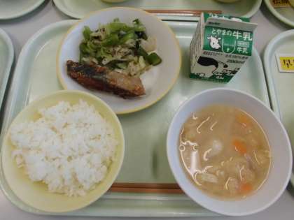 今日の給食は、ごはん・牛乳・白玉汁・梅肉和え・魚のたつたあげです。梅肉和えは、小松菜・キャベツ・アスパラを梅肉で和えてあります。酸味があっておいしいですね!