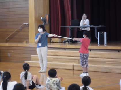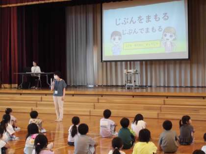 富山県防犯協会から講師を招き、こども防犯教室を開きました。これまで声掛けや連れ去りなど危ない事件が起きている時間や場所などを教えていただきました。また、声掛けの断り方、距離の取り方、防犯ブザーの身に付け方など代表児童の子供たちと実演を通して学びました。これから夏休みに入りますが、自分の身を自分で守ることを改めて確認しました。
